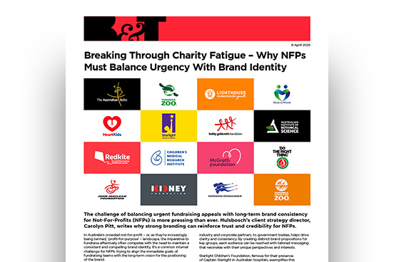 The challenge of balancing urgent fundraising appeals with long-term brand consistency for Not-For-Profits (NFPs) is more pressing than ever. Hulsbosch’s client strategy director, Carolyn Pitt, writes why strong branding can reinforce trust and credibility for NFPs.